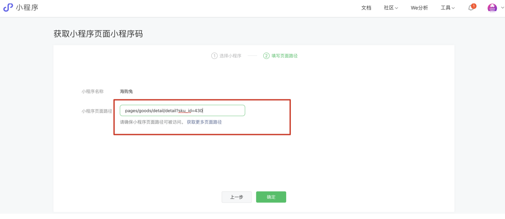 :-: 图2:点击工具—生成小程序码—输入小程序名称(例:海购兔)—点击小程序—下一步