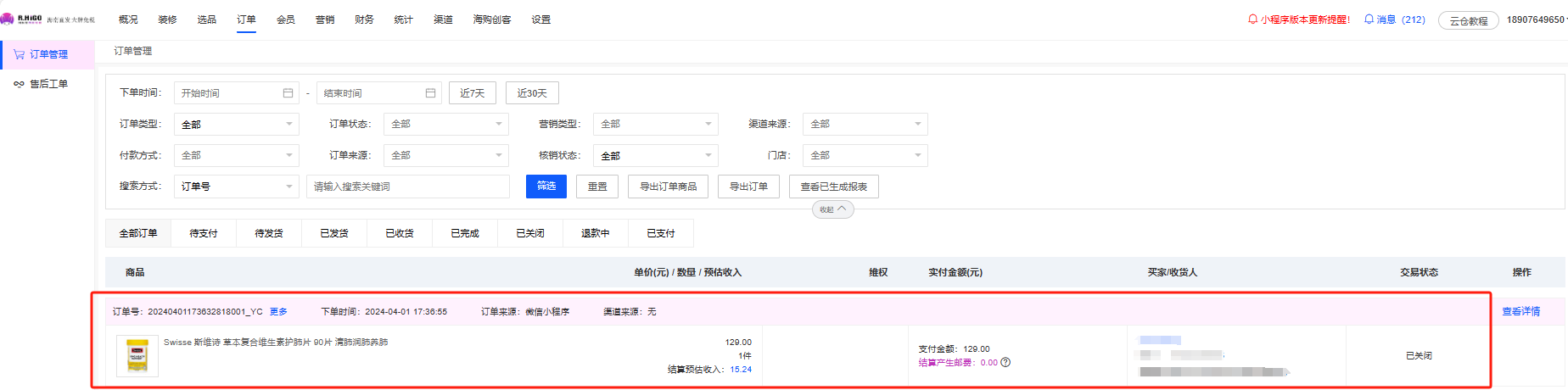 如下图所示,图片中的界面为商户端订单管理页面,订单管理能够跟踪查看每一笔订单的信息