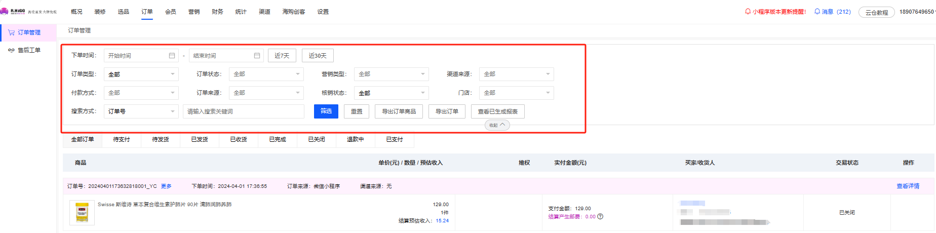 订单可以根据上方组件进行筛选,包括下单的时间、订单来源(渠道)、营销活动以及订单号搜索等,便于管理人员快速筛找相应订单