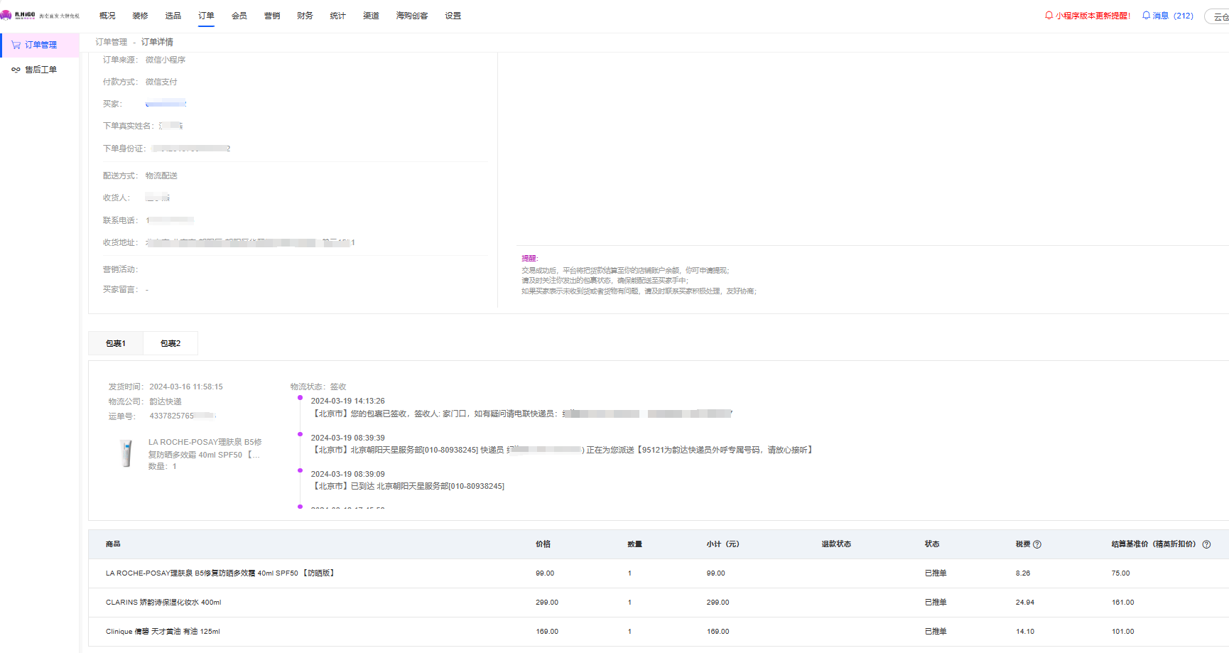 底部则可以看到订单信息,包括订单相应的商品销售价格、预估金额、收货人信息、交易状态等