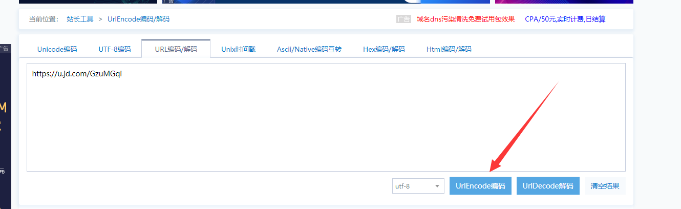 2. 之后,点击这个链接 [url编码](http://tool.chinaz.com/tools/urlencode.aspx) ,把上面复制到的 京东推广链接,进行url编码,点击下图中的 编码按钮,会生成编码后的 推广链接