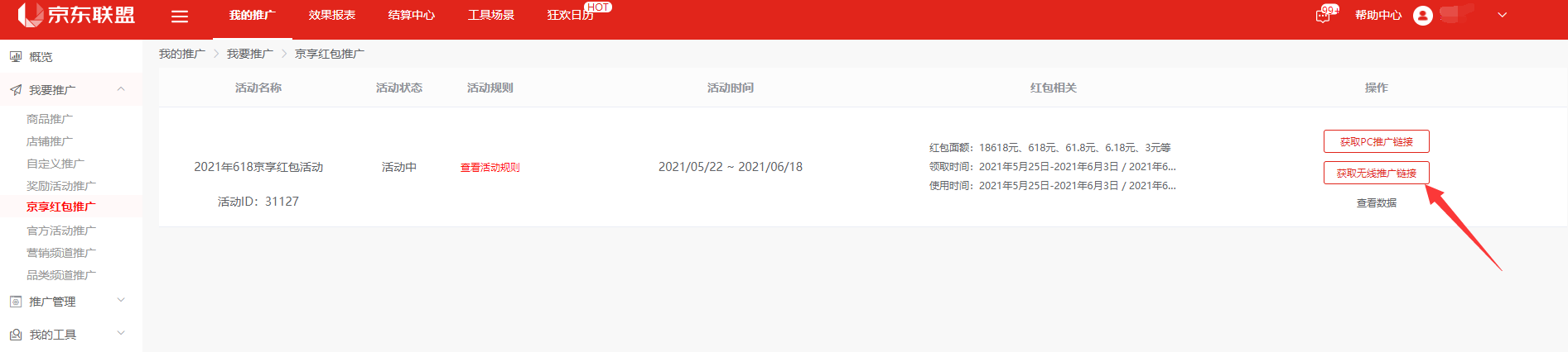 1,获取京东商品 或者 京东活动页的 短链/长链 推广链接,以 618京享红包活动 为例,获取链接,截图如下:
