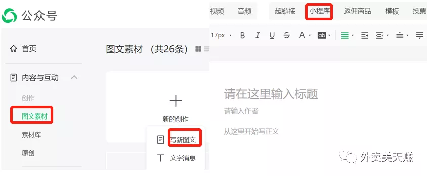 1.左侧菜单“图文素材”>>新的创作>>写新图文>>小程序