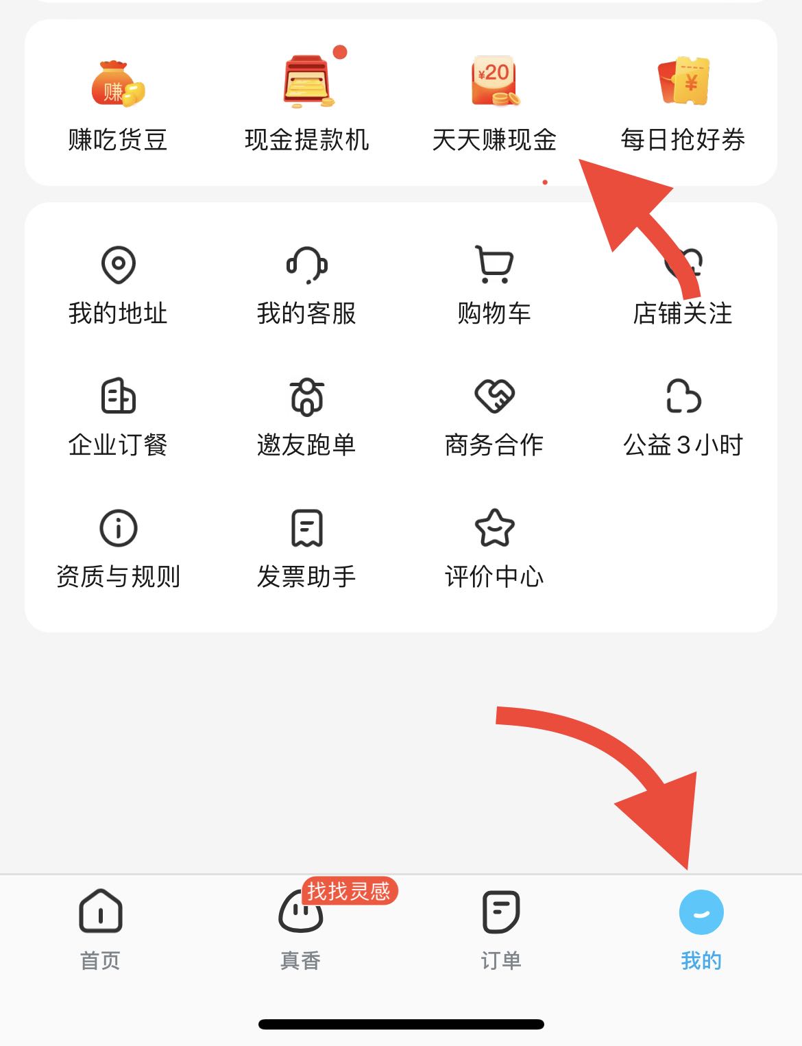 1. 打开 “饿了么” APP ,找到 “我的”页面中 “天天赚现金” 页面