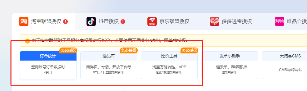 # 8。最后需要去 大淘客 统一授权中心, https://www.dataoke.com/shouquan?key_type=4&type=1 将务必授权的地方都进行淘宝授权 且 添加 默认PID