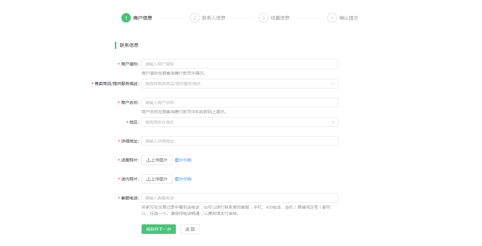 根据页面提示填写商户基本信息,需要填写商户名称、地址、店面照片、店内照片、客服电话等。