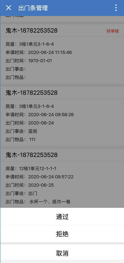 * 住户提交出门条后,可在操作栏中,审核通过或失败: