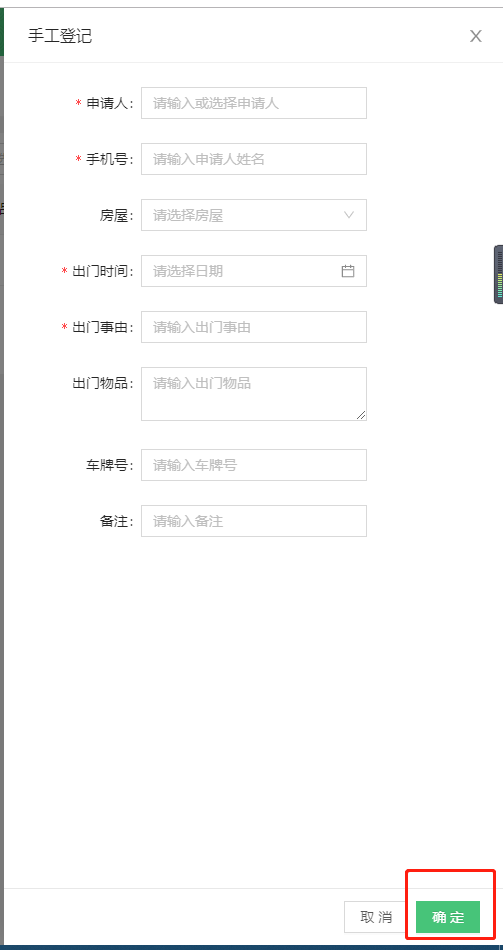 * 填写出门条信息,然后点击“确定”: