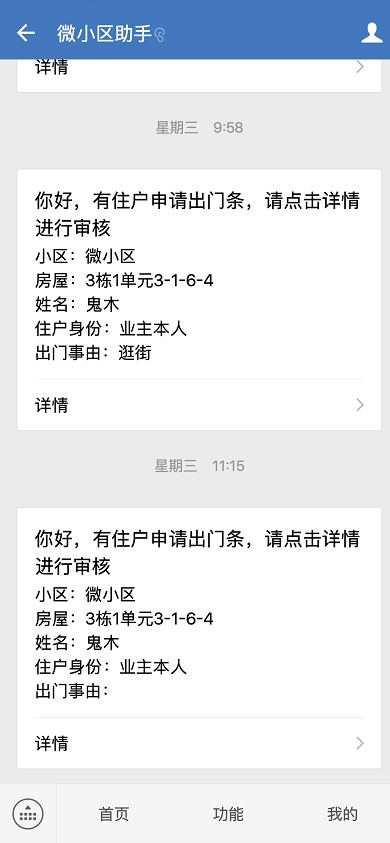 在小区日常管理中,住户搬家等事务需要开具出门条,微物业帮助物业企业快速实现电子出门条管理,住户只需在【电子通行证系统】小程序上填写资料申请,通过审核后即可使用。