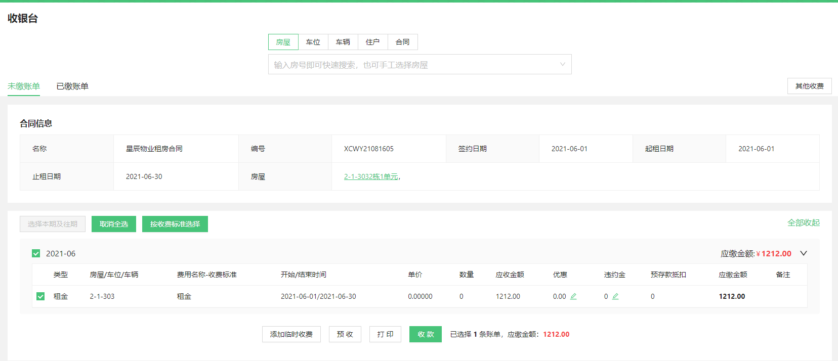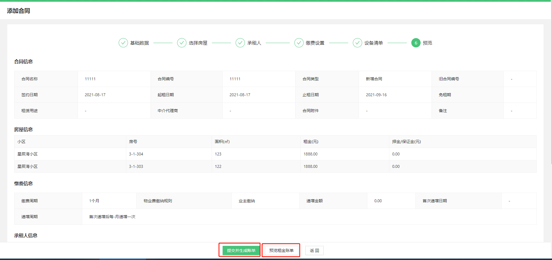 点击下方 “预览租金账单” 按钮核对租金账单信息,确认无误后点击 “提交并生成账单”按钮,完成合同的添加: