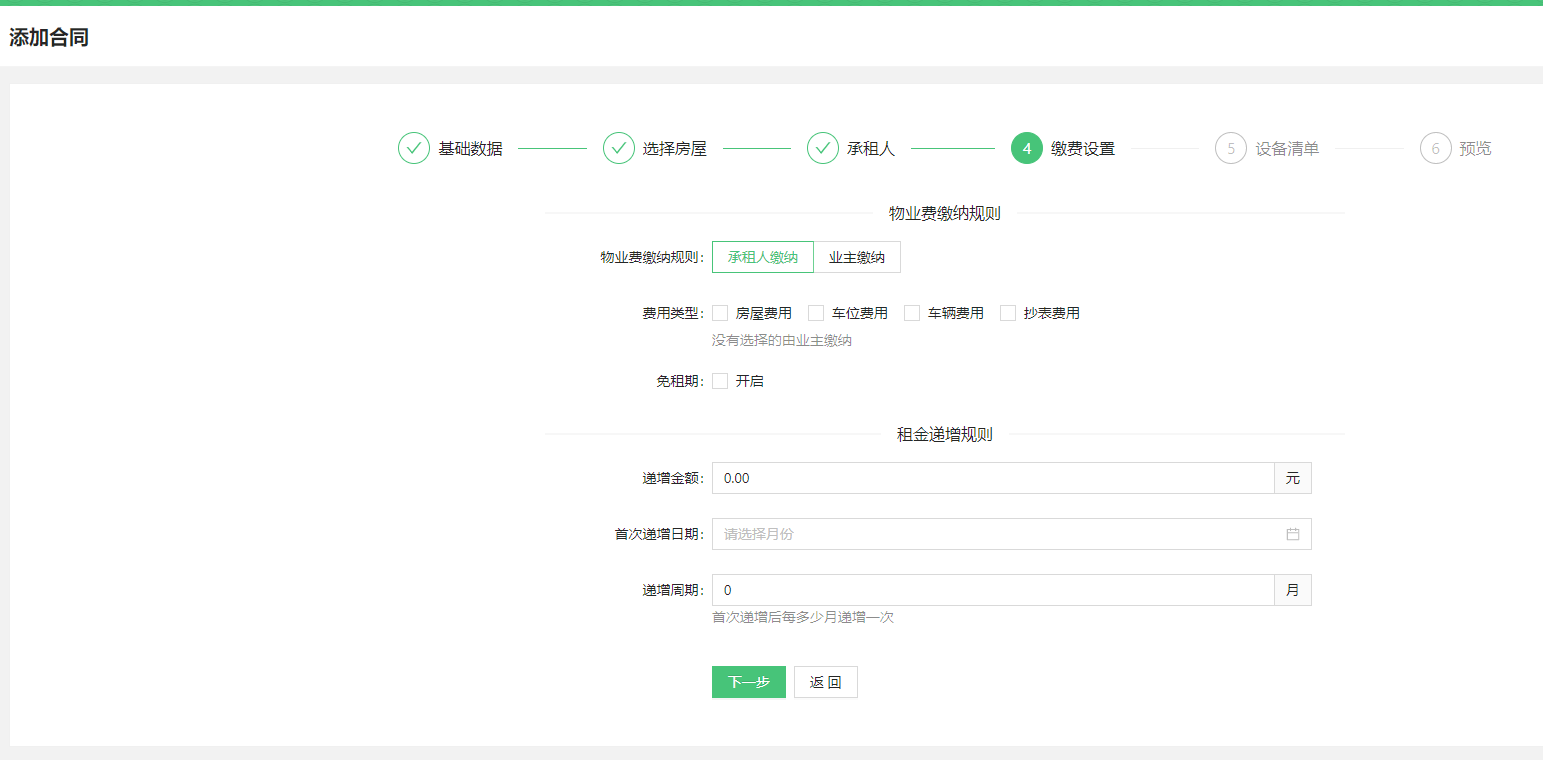 > 租金递增规则:可设置某个月开始增加租金,首次增加租金后,每多少月再次增加同等金额租金。