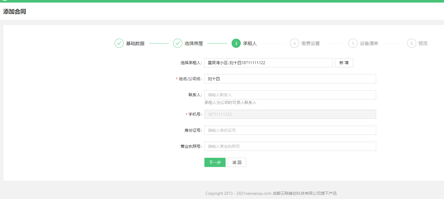 第三步,完善承租人信息,可从已有住户里选择,或新增承租人: