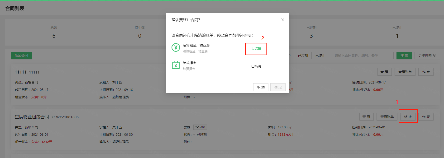 如需终止当前合同,可点击对应合同的 “终止”按钮,终止合同需先结清当前合同的租金、物业费、押金: