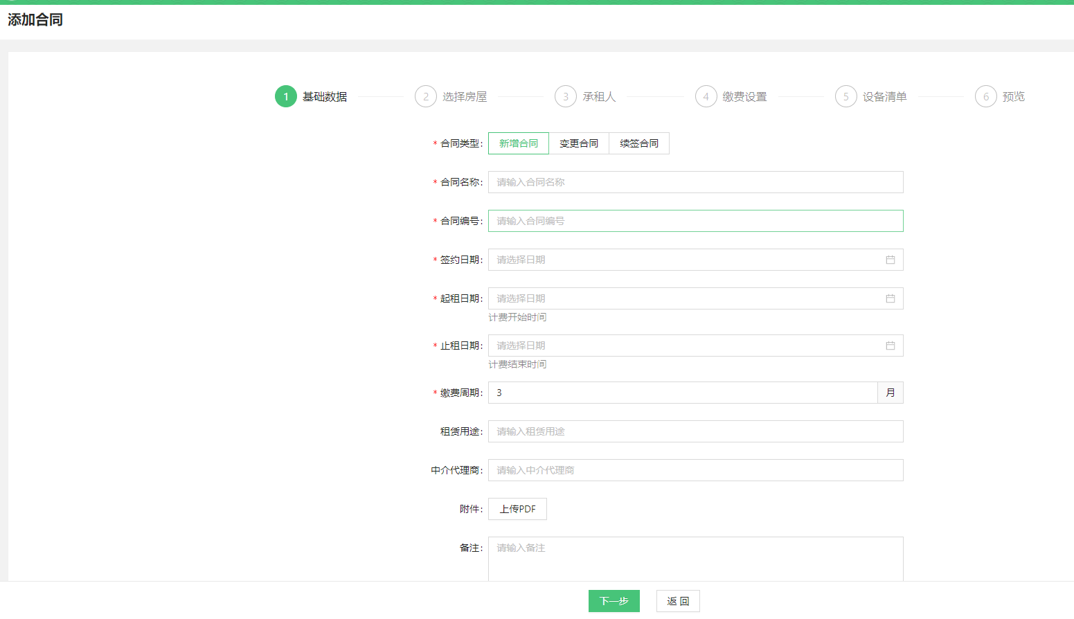 点击左侧 “添加合同” 按钮,进入添加合同流程