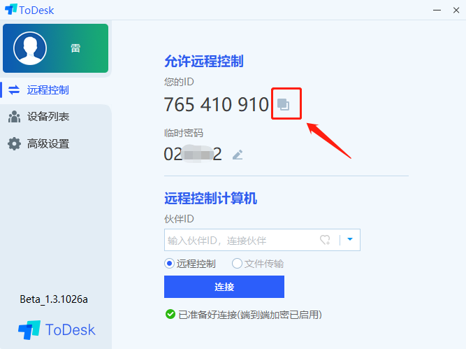 安装好之后打开远程工具,点击复制按钮,复制ID和临时密码,如图: