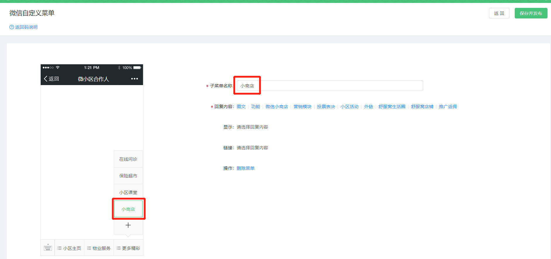 3、最后点击右上角“保存并发布”按钮,完成小商店菜单的添加。