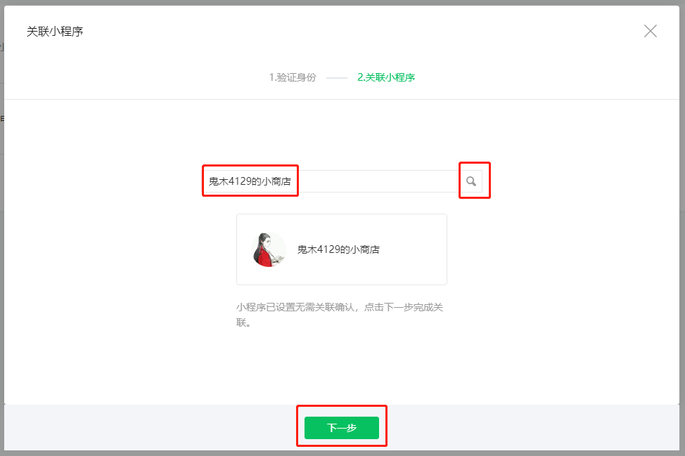 然后直接点击“下一步”,完成小程序与公众号的关联,如图: