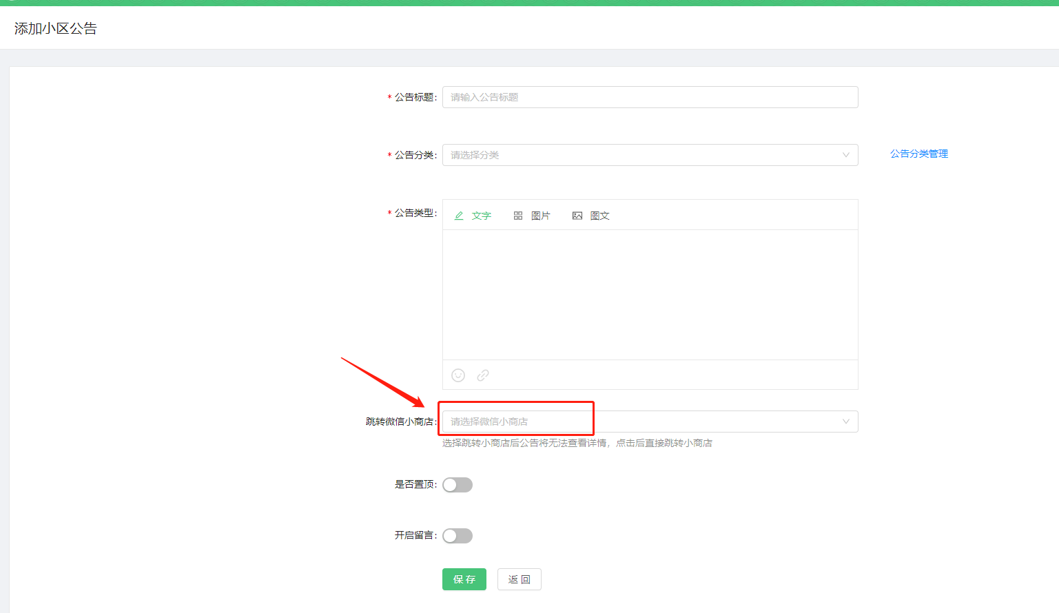 设置方式为:编辑公告详情,选择跳转的微信小商店,点击“保存”即可生效,如图: