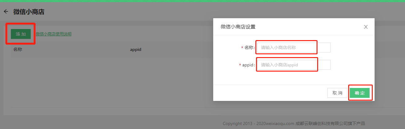 点击“添加”按钮,填写小商店名称、APPID信息,如图: