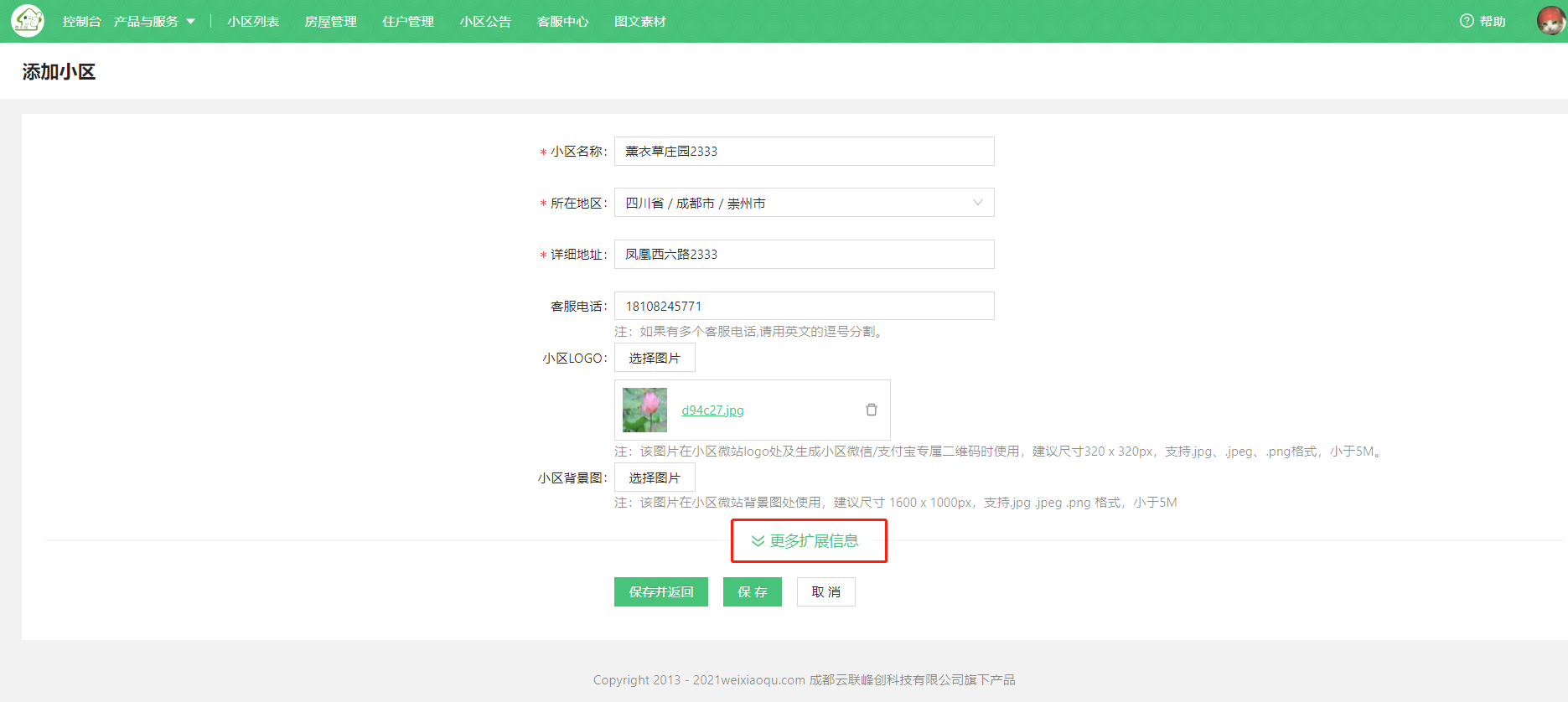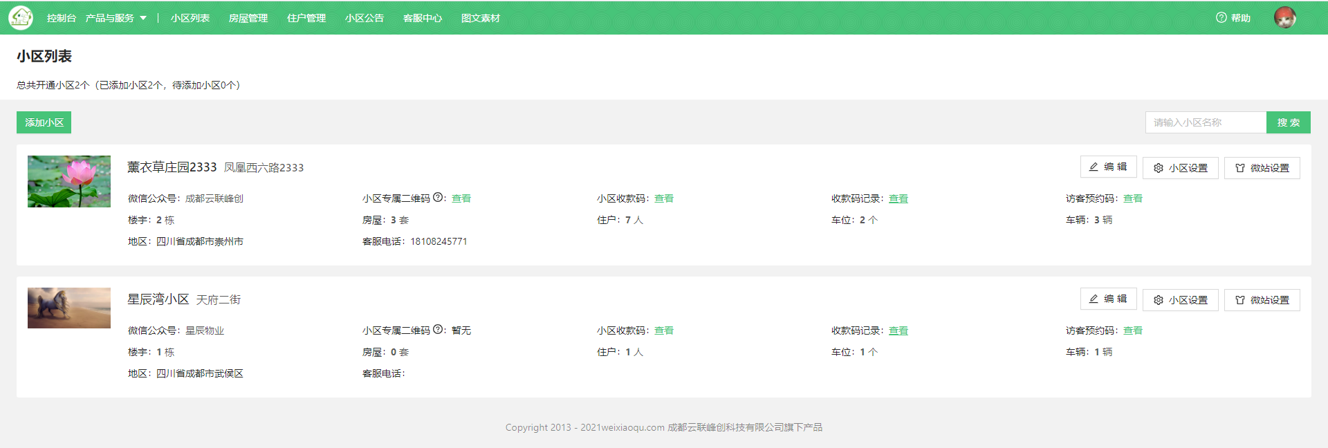 在微物业系统中,小区是最基本的数据单位,所有的房屋、车辆、住户等数据都以小区为单位进行划分。微物业支持添加多个小区,无论物业公司管理多少个小区,都可以在微物业管理中心中进行添加和管理。