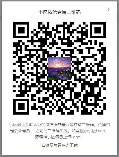 关联小区到公众号之后,点击“数据中心”——》“小区列表”,进入小区列表页,点击该小区的微信二维码图标,可立即生成该小区对应的专属二维码,如下图所示: