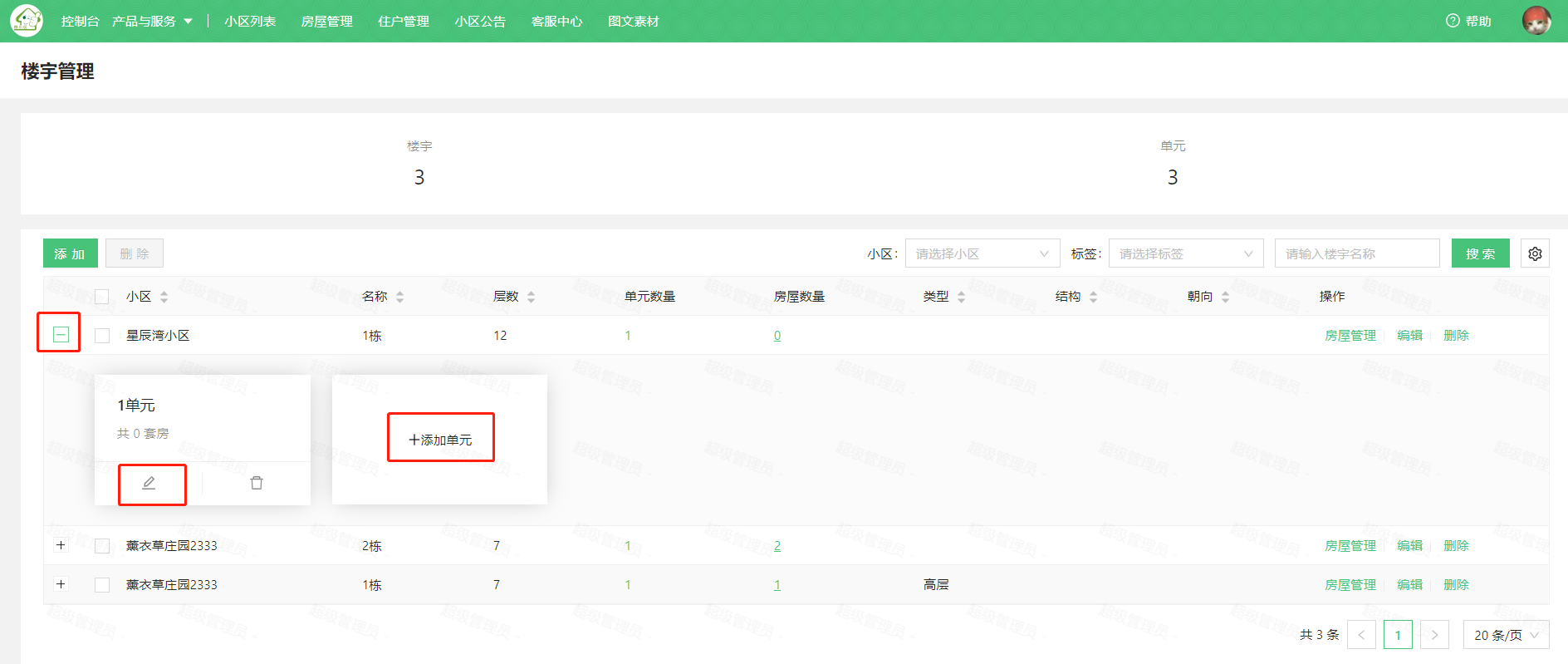 点击楼宇左侧加号“+”展开单元信息,可编辑单元名称、添加单元,如图: