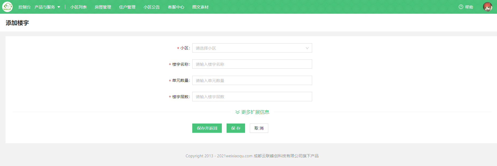 > * 添加楼宇前请先选择小区。若当前没有小区请到【数据中心 — 小区列表 — 添加小区】添加。