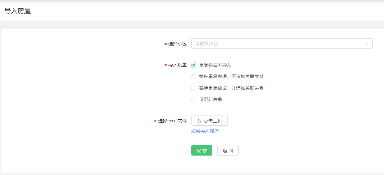 > * 重复数据不导入:如房号已存在,则该房屋数据不导入;