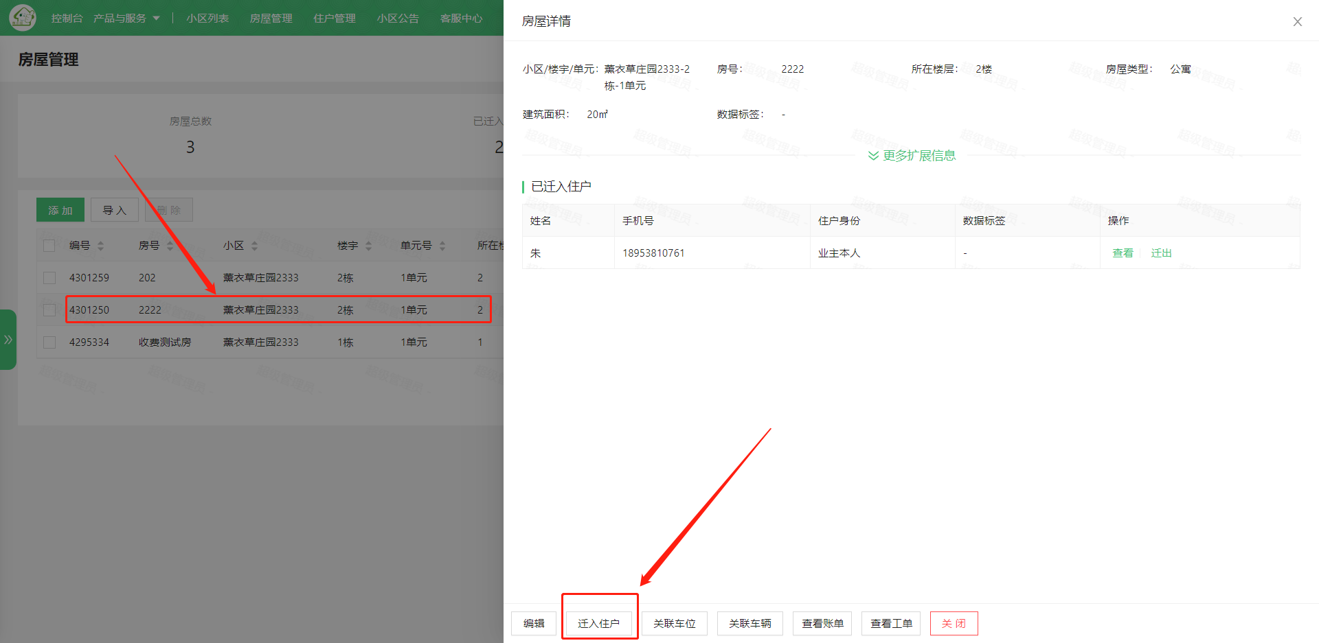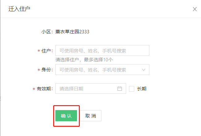 选择需要迁入的住户、身份、有效期,点击“确认”按钮即可完成住户与房屋的绑定。