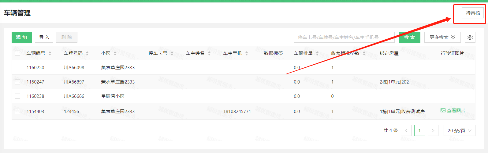 住户手机端提交车辆审核后,物业可在车辆管理界面右上角进行查看、审核操作。