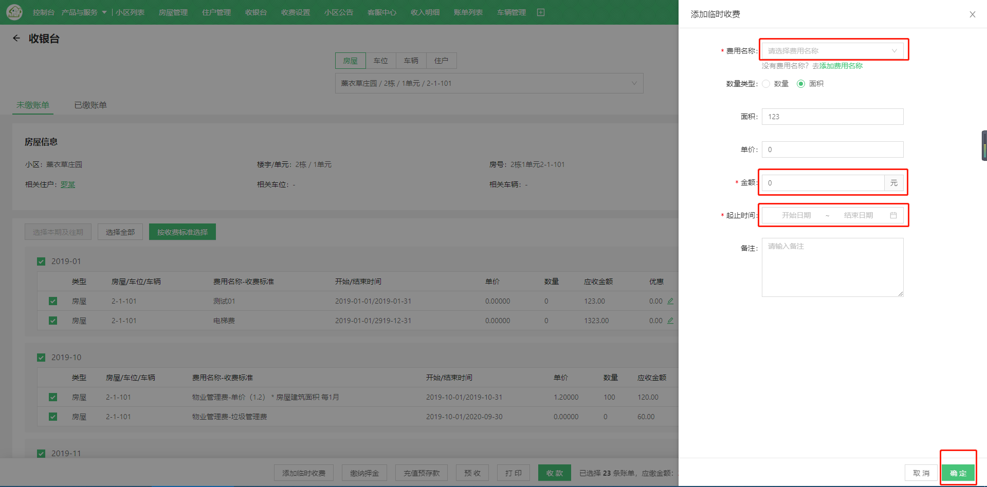 * 按照下图提示,选择费用名称、填写金额、选择费用的起止时间。最后点击“确定”,临时收费就添加好了。