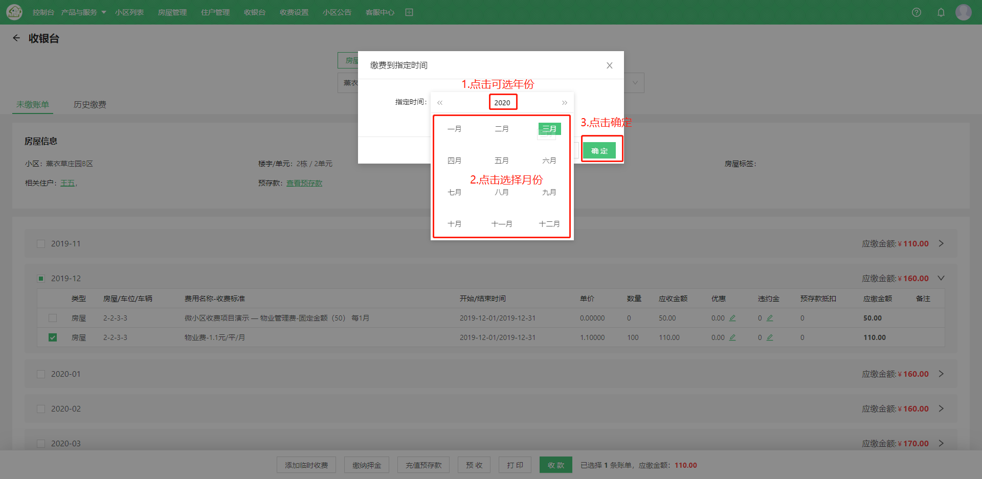 > * “操作”里的“查看明细”可筛选这个房的部分账单进行收费。