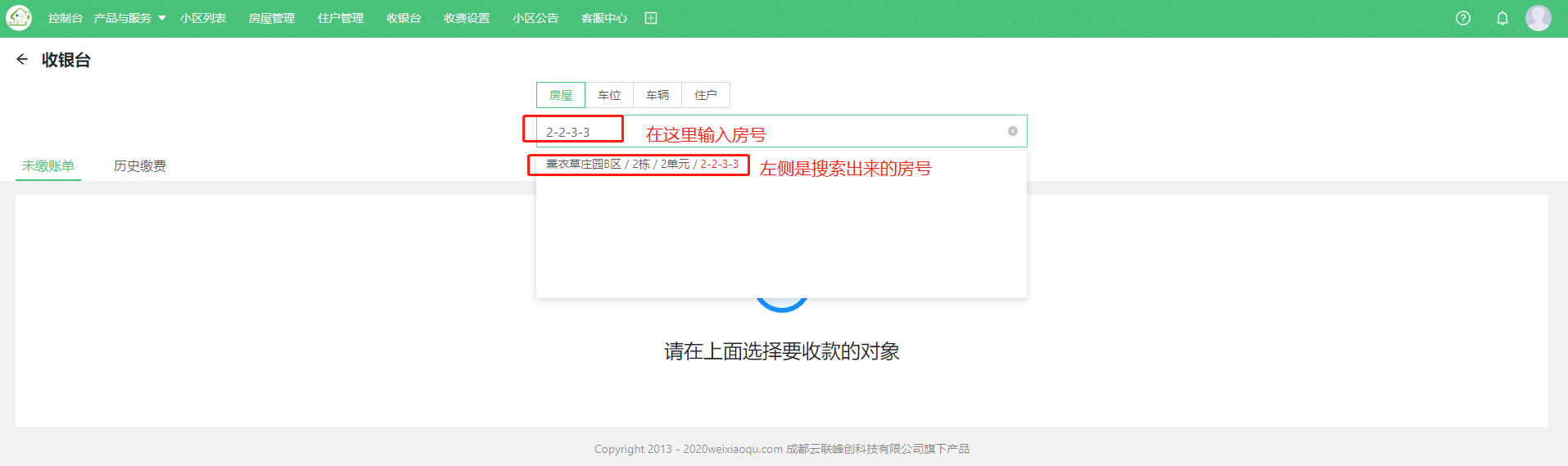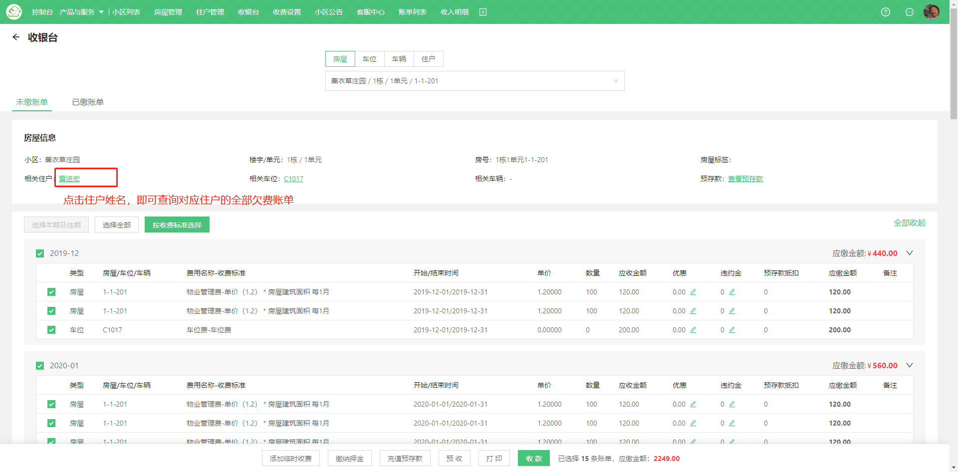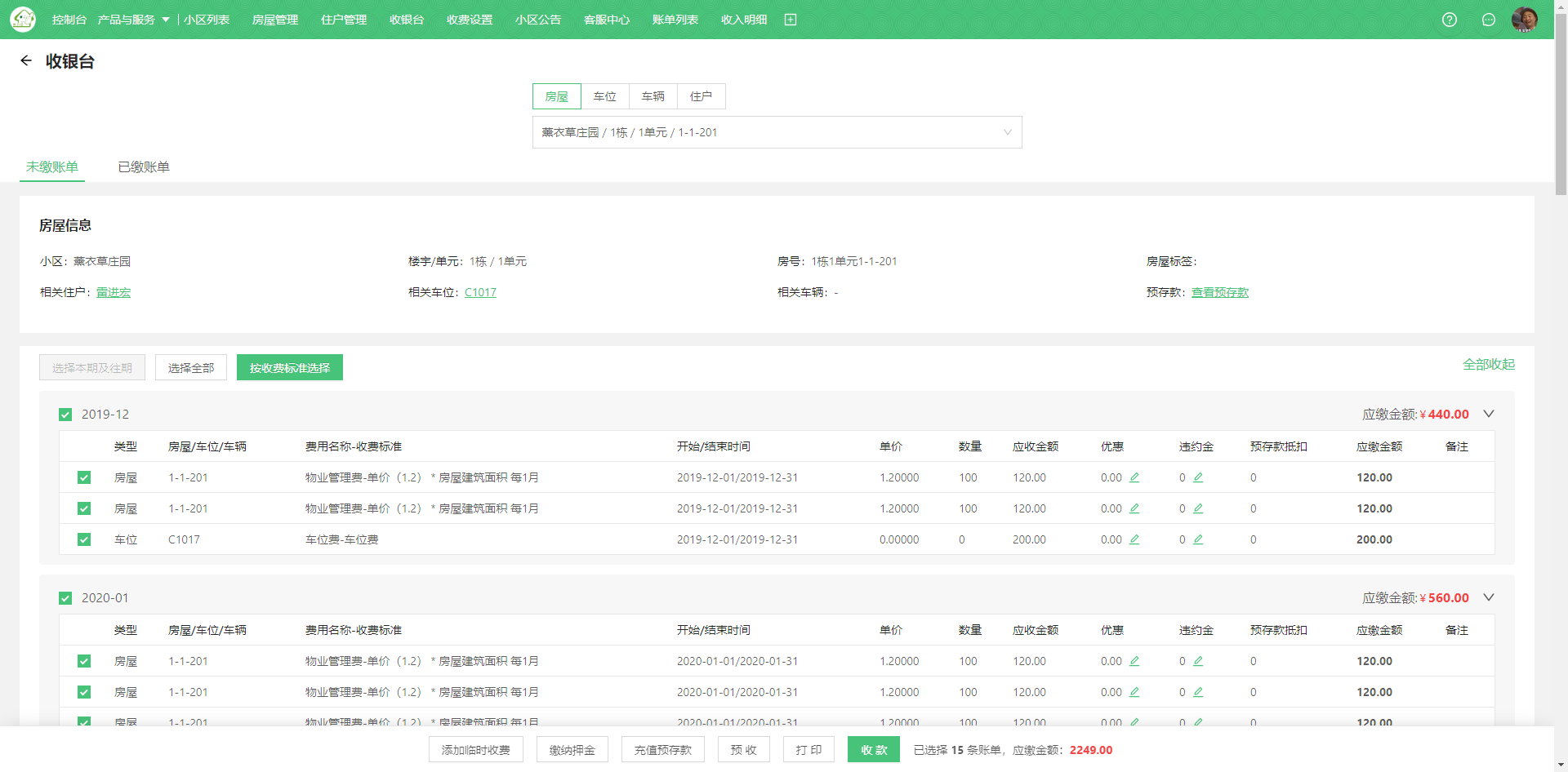 在收银台,小区管理员可以对房屋、车位、车辆、住户的未缴费用账单进行查询和收取。