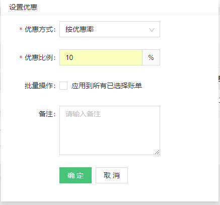 * 直接输入需要优惠的比例,再点击确定。可勾选优惠应用到所有已选择的账单。(例:如需要优惠10%,就直接输入10,载点击确定)