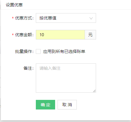 * (1)按值优惠:直接输入需要优惠的金额,再点击“确定”。可勾选优惠应用到所有已选择的账单。(如:需要优惠10元,就直接输入10,再点击“确定”)。