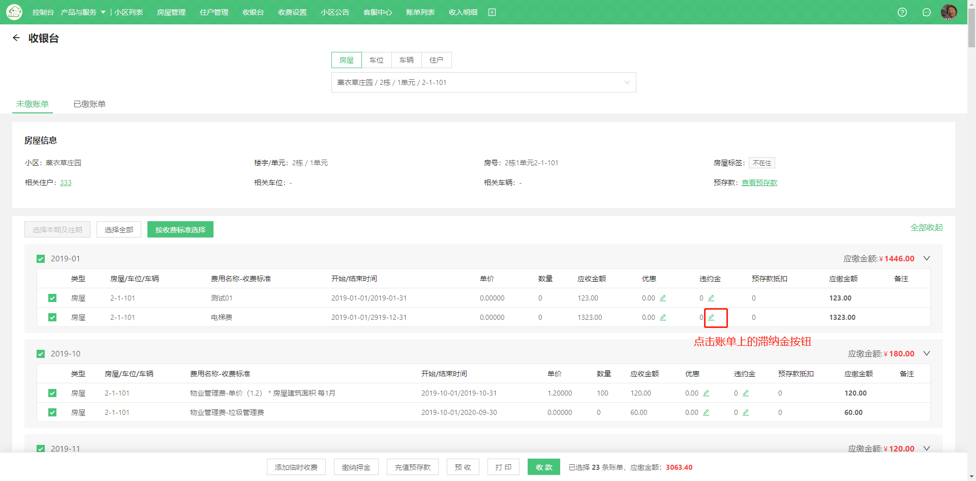 * 按房号查询账单后,点击账单违约金栏中的“编辑”按钮,如下图: