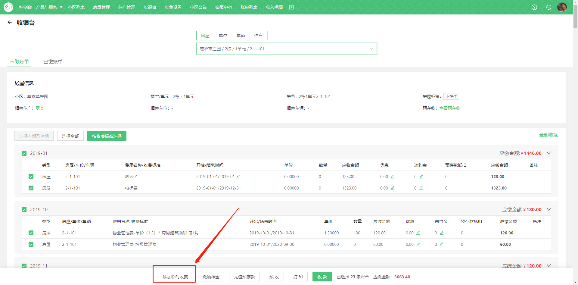 * 按房号查询账单后,点击下方“添加临时收费”按钮,如下图所示: