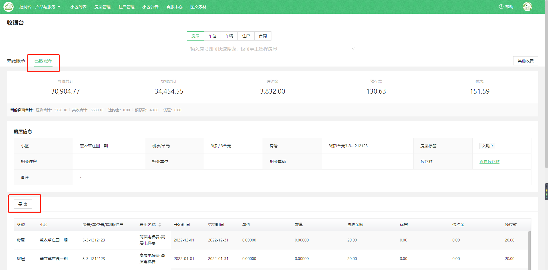 * 按房号查询账单后,点击界面左上角 “已缴账单” 页签,即可查看该房屋相关的全部已缴费用账单明细、费用总计。并且支持导出已缴账单。如下图所示: