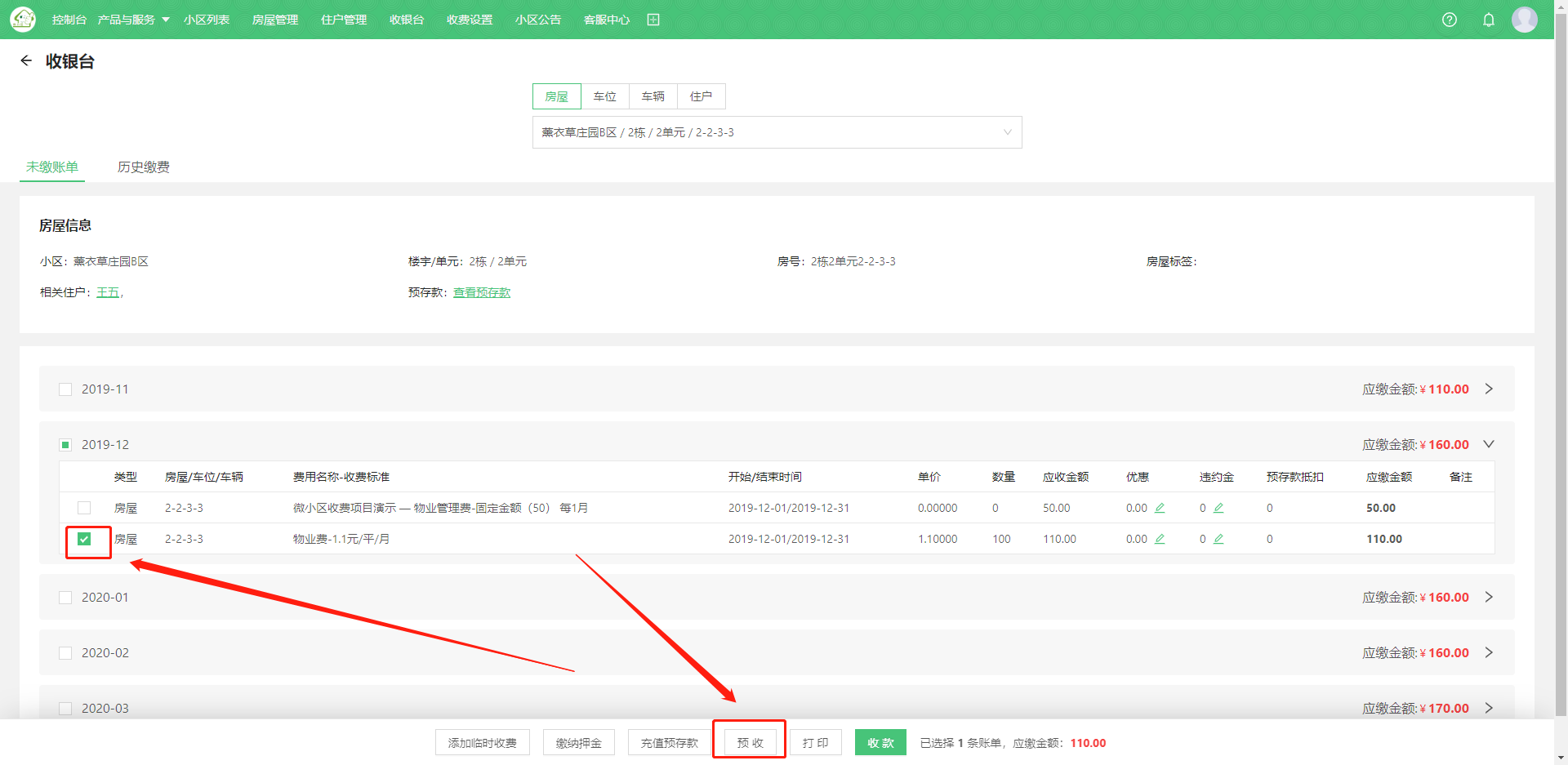 * 按房号查询账单后,勾选一条收费标准对应的账单,再点击“预收”按钮。(如:需要预收物业费-1.1/平/月,则勾选一条物业费-1.1/平/月的账单,再点击“预收”按钮)