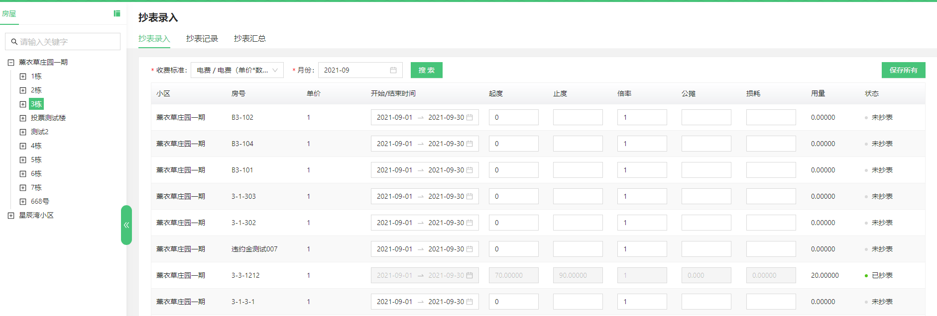 * 在抄表数据表格中,依次填写开始时间、结束时间、起度、止度、倍率、公摊,并保存,如下图所示:
