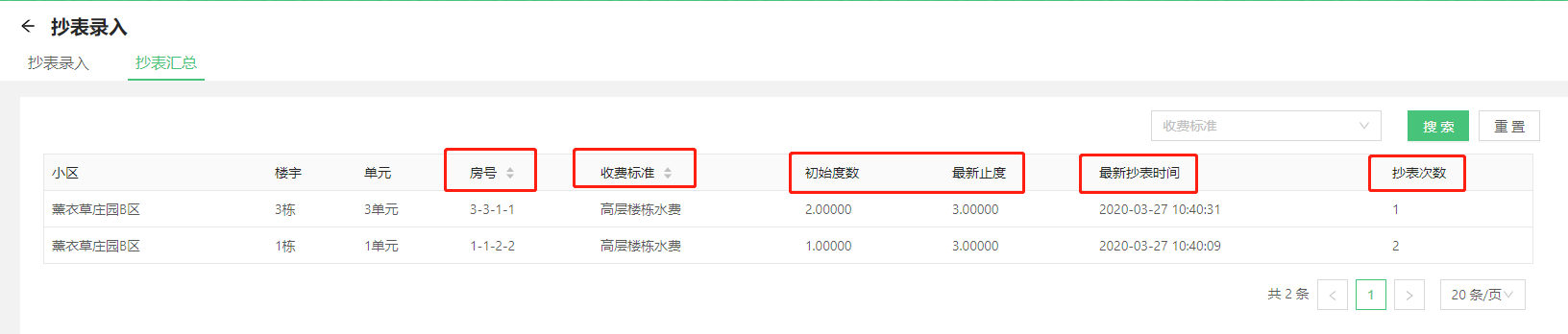 在抄表汇总界面可单独查看每房屋抄表费用汇总。