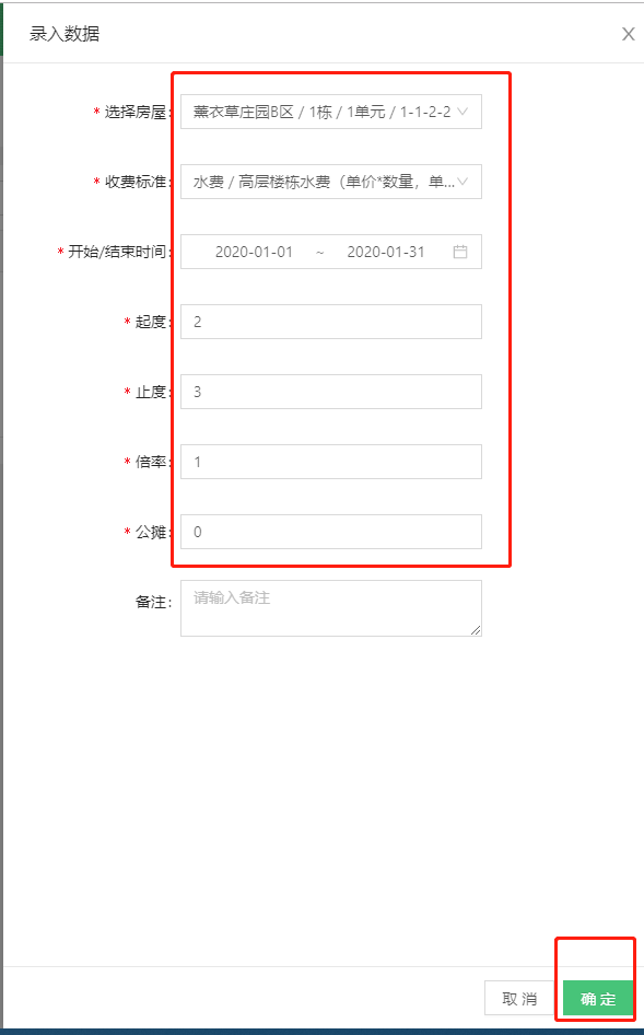 * 选择房屋、收费标准、开始/结束时间,录入起度、止度、倍率、公摊,并点击“确定”。如下图所示: