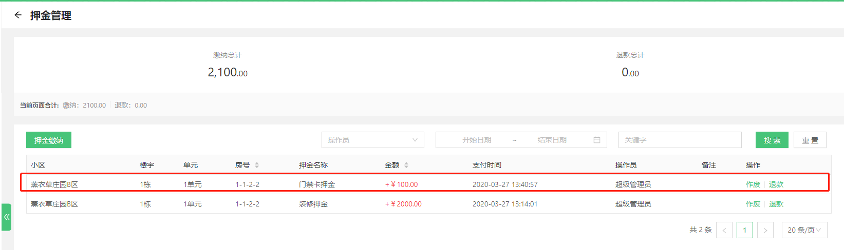 * 登录微物业管理中心—》收费管理—》押金管理,找到需要作废的押金记录。