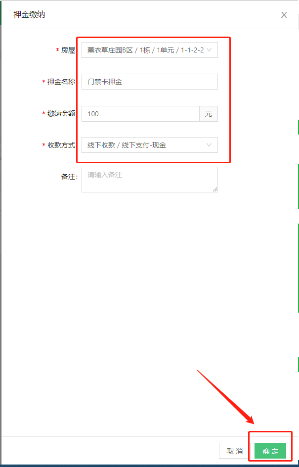* 选择房屋、填写押金名称、缴纳金额、选择收款方式,再点击“确定”。
