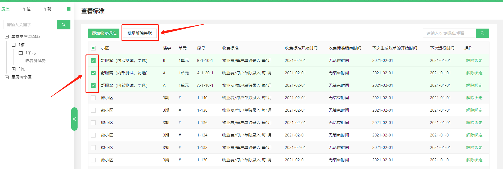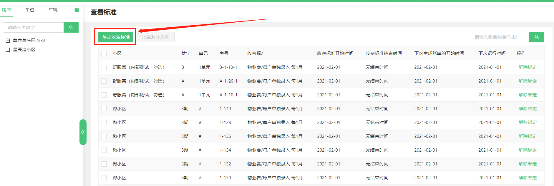 **此功能模块可以给小区的房屋、车位、车辆,批量添加、删除收费标准。**