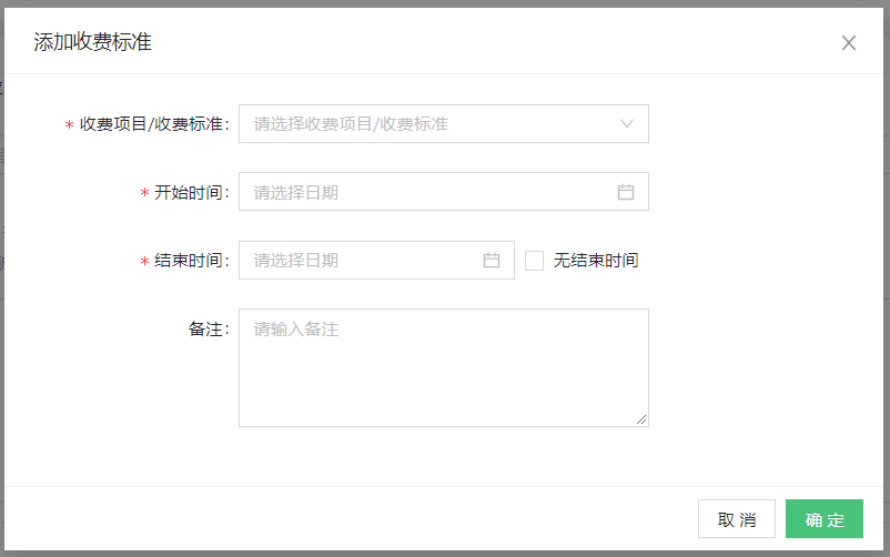 > * 结束时间:超过结束时间,不再生成费用账单。如需一直按此标准收取费用,则选择无结束时间。