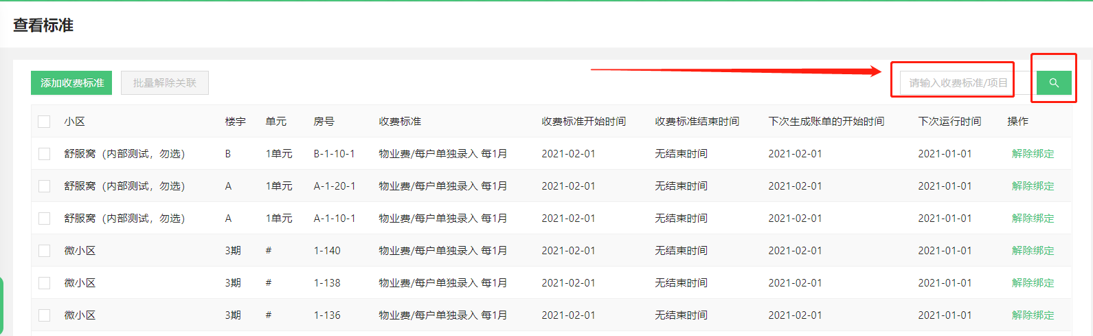 如只需解除某个收费标准和房屋的绑定,可在右上角搜索收费项目名称或收费标准名称,如下图: