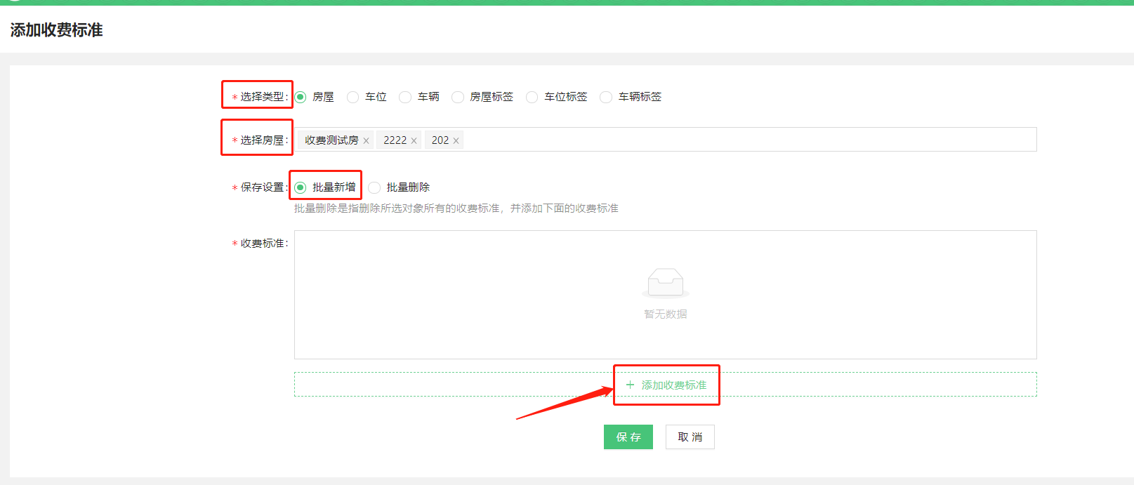> * 保存设置-批量新增:在房屋原有收费标准的基础上增加收费标准。