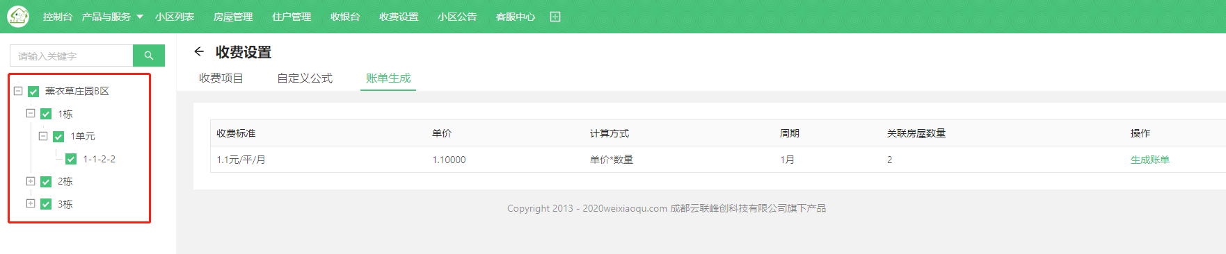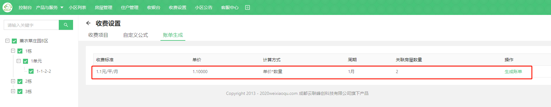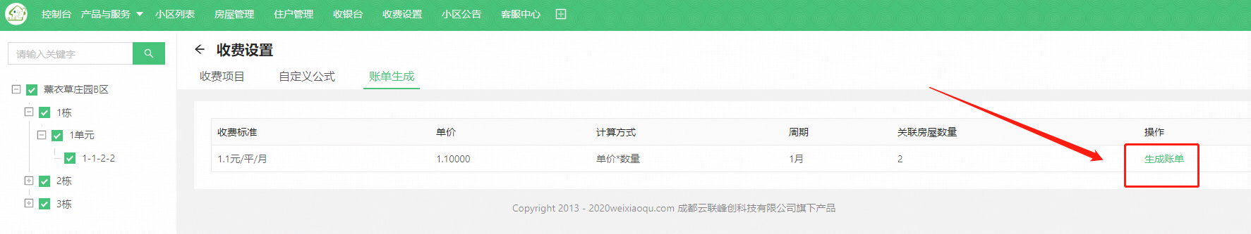 * 登录微物业管理中心=》收费管理=》收费设置=》账单生成 界面,