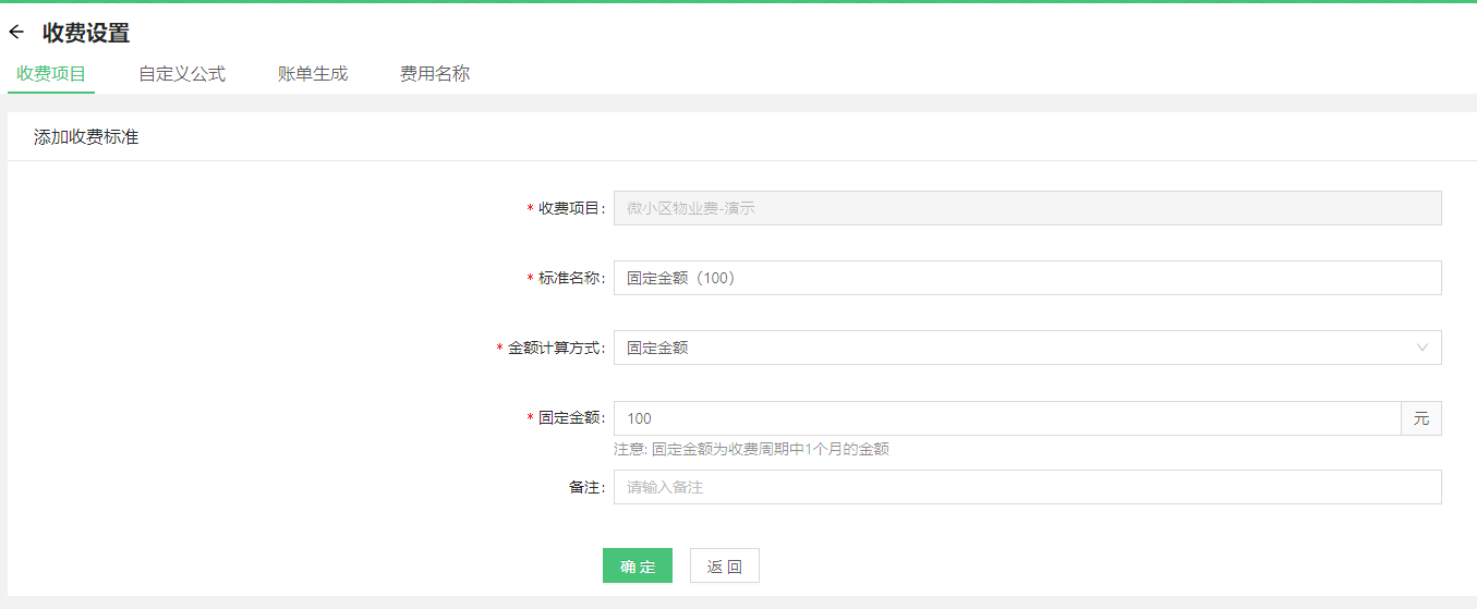 ### 3、收费标准(金额计算方式:固定金额)填写示例: